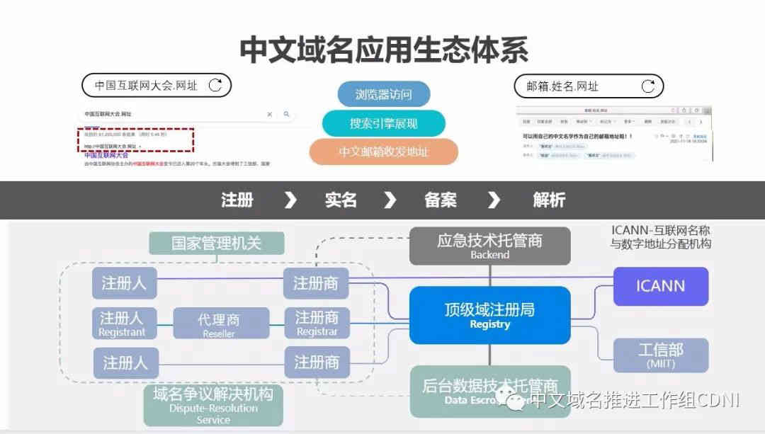 “进一步推动中文域名推广应用”,则强调了应用的重要性。对此,业界要加大中文域名的宣传普及工作;呼吁和鼓励各方在积极注册中文域名的同时启用和宣传中文域名,从而最大程度让广大网民知晓中文域名,并尝试使用中文域名。