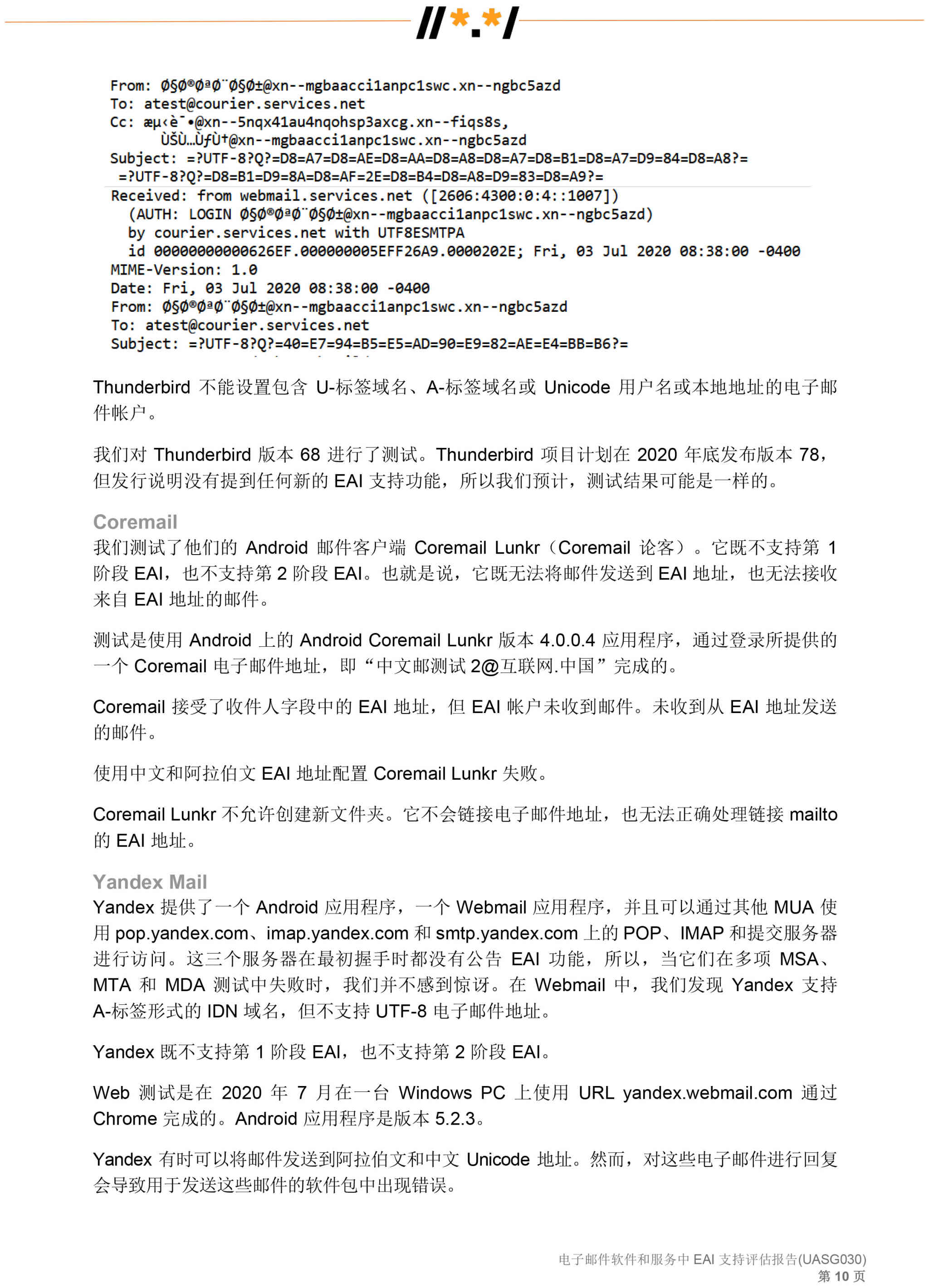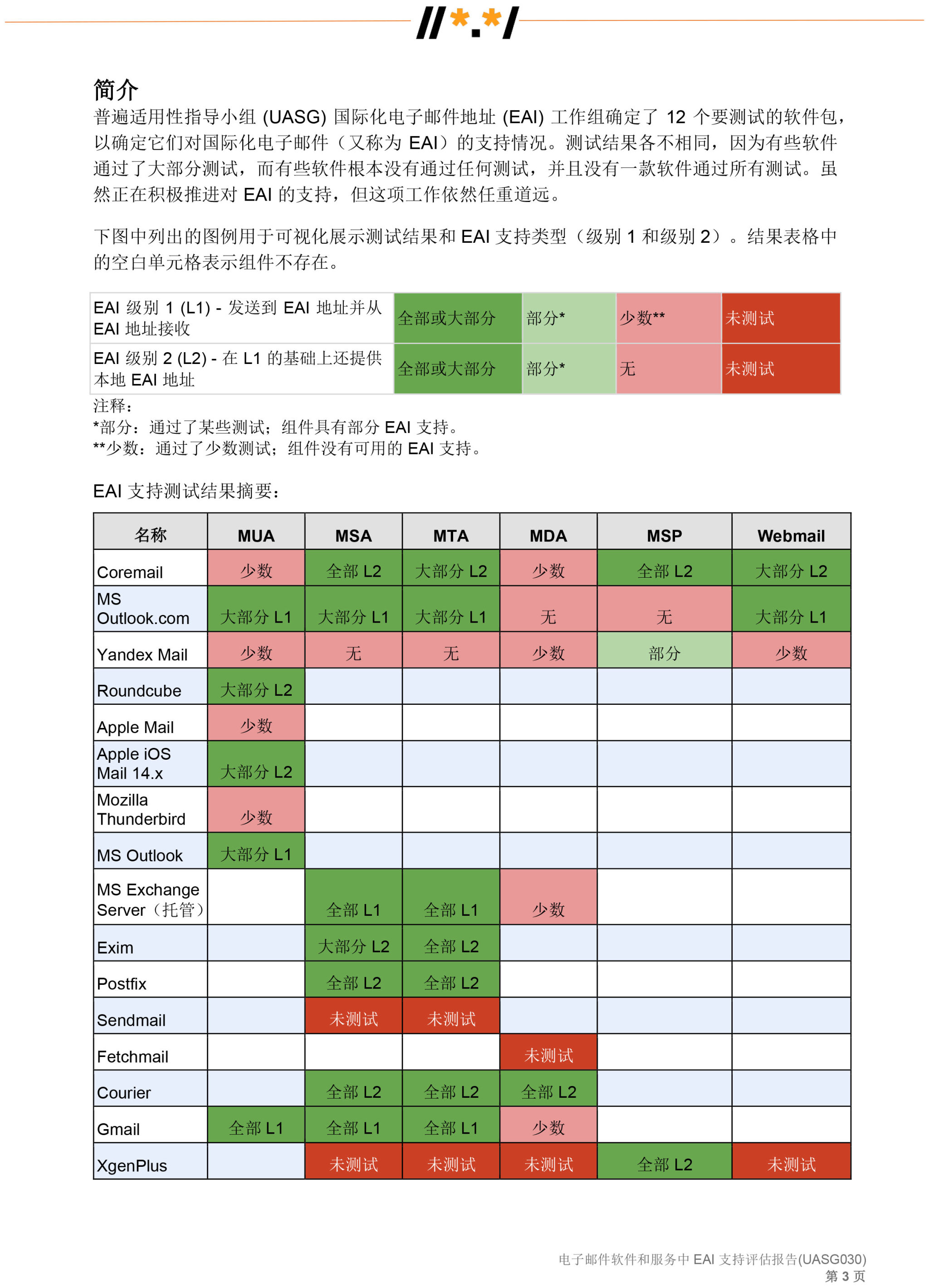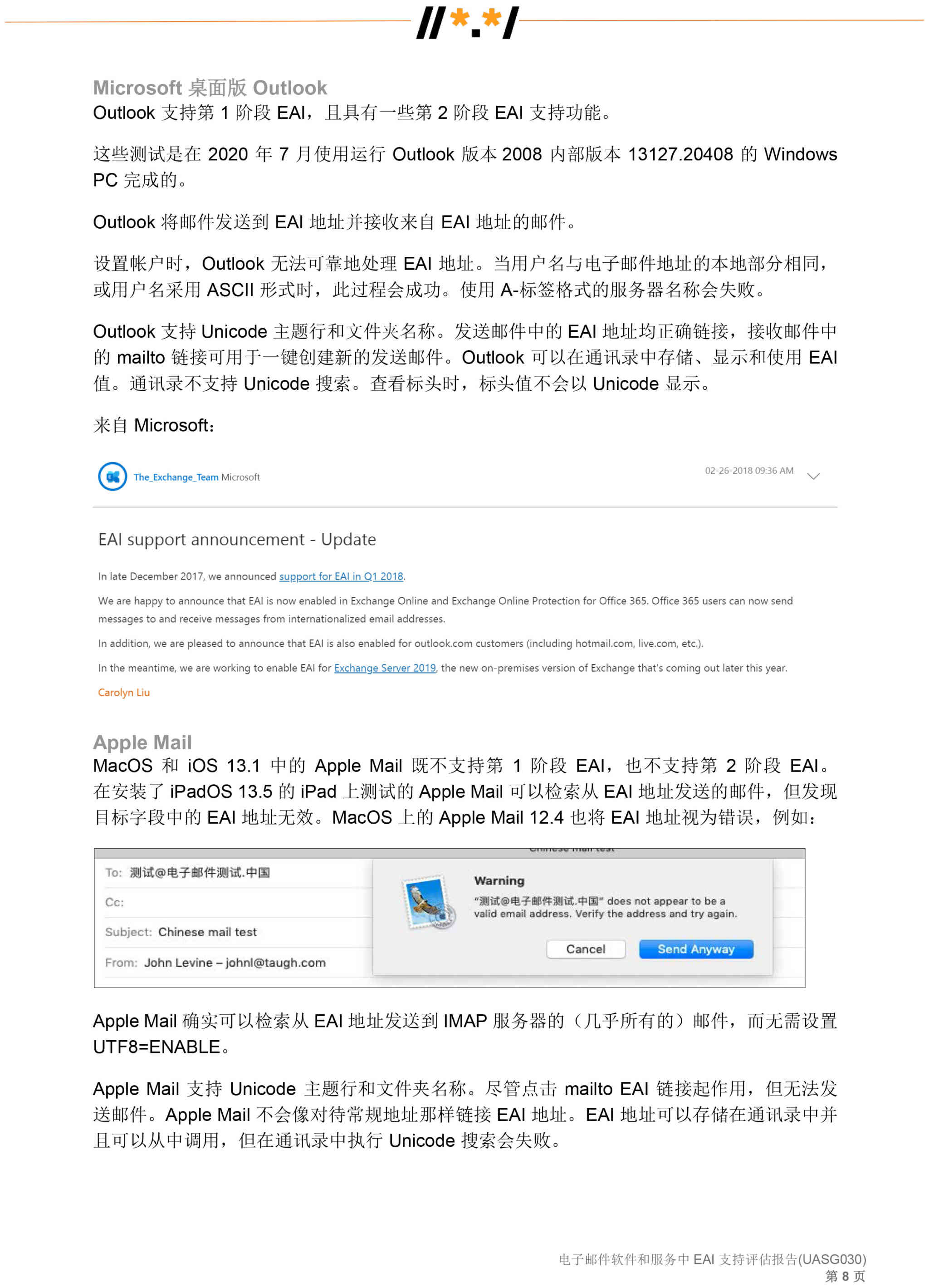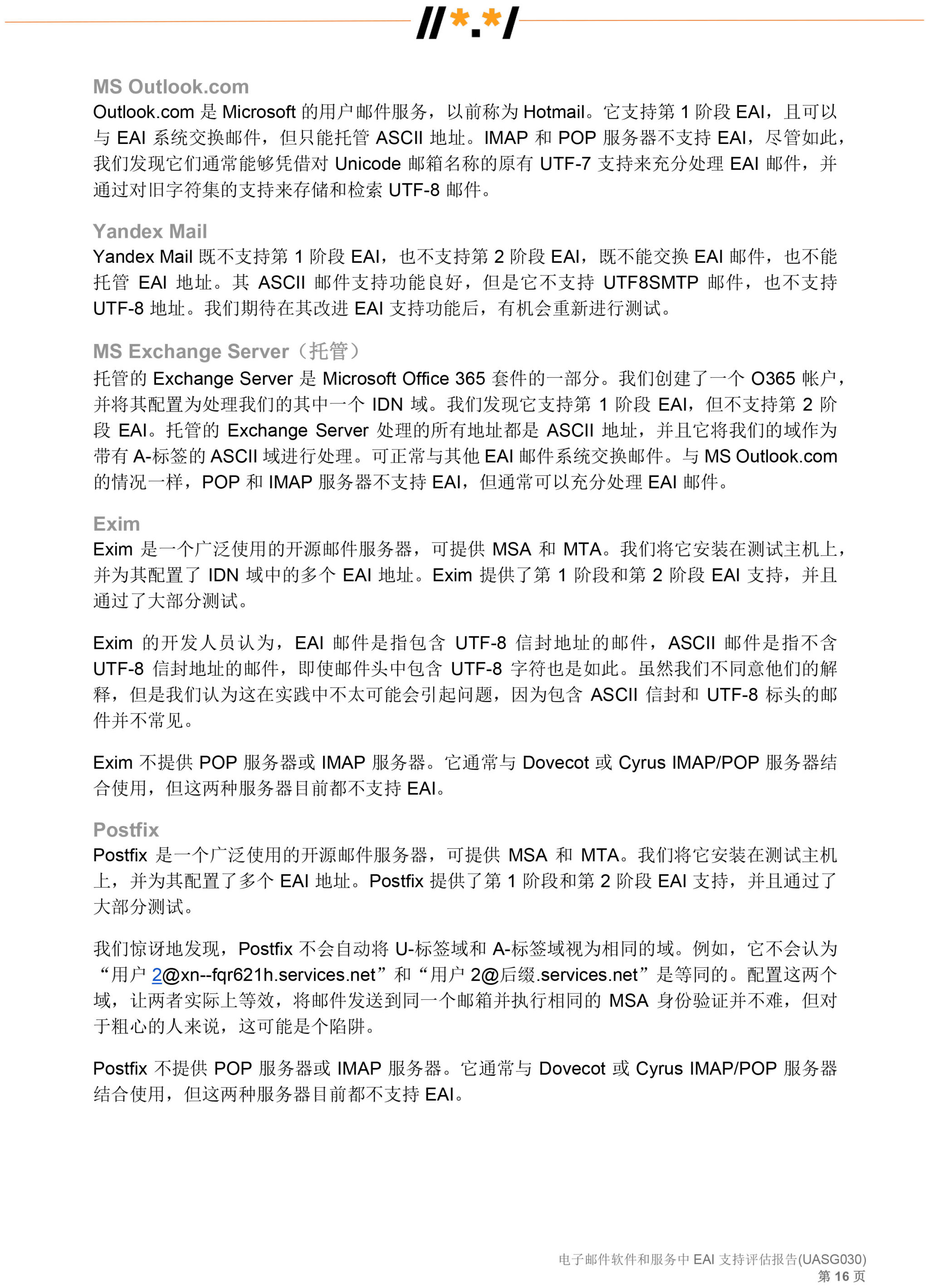 电子邮件软件和服务 中 EAI 支持评估报告 (UASG030)