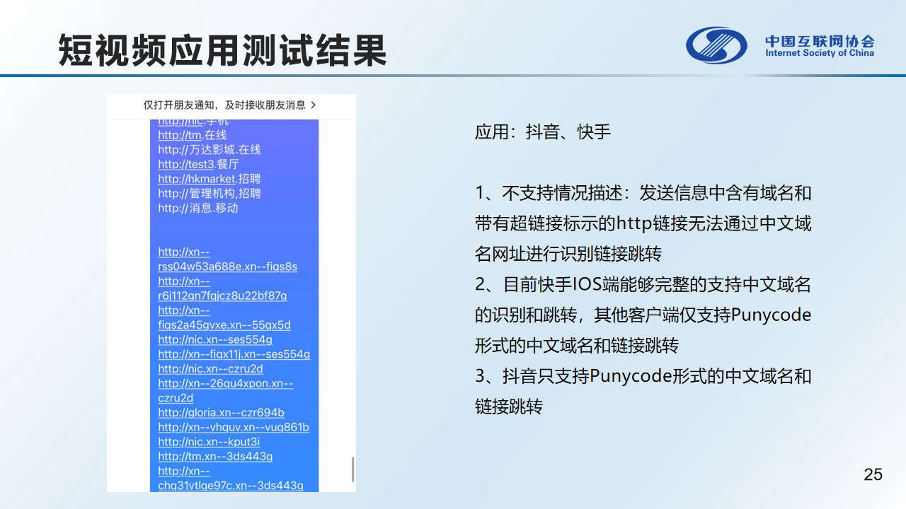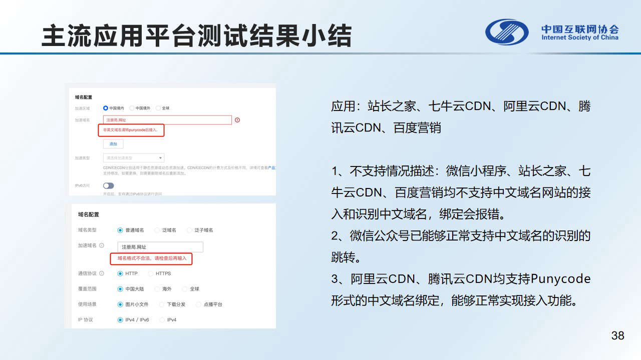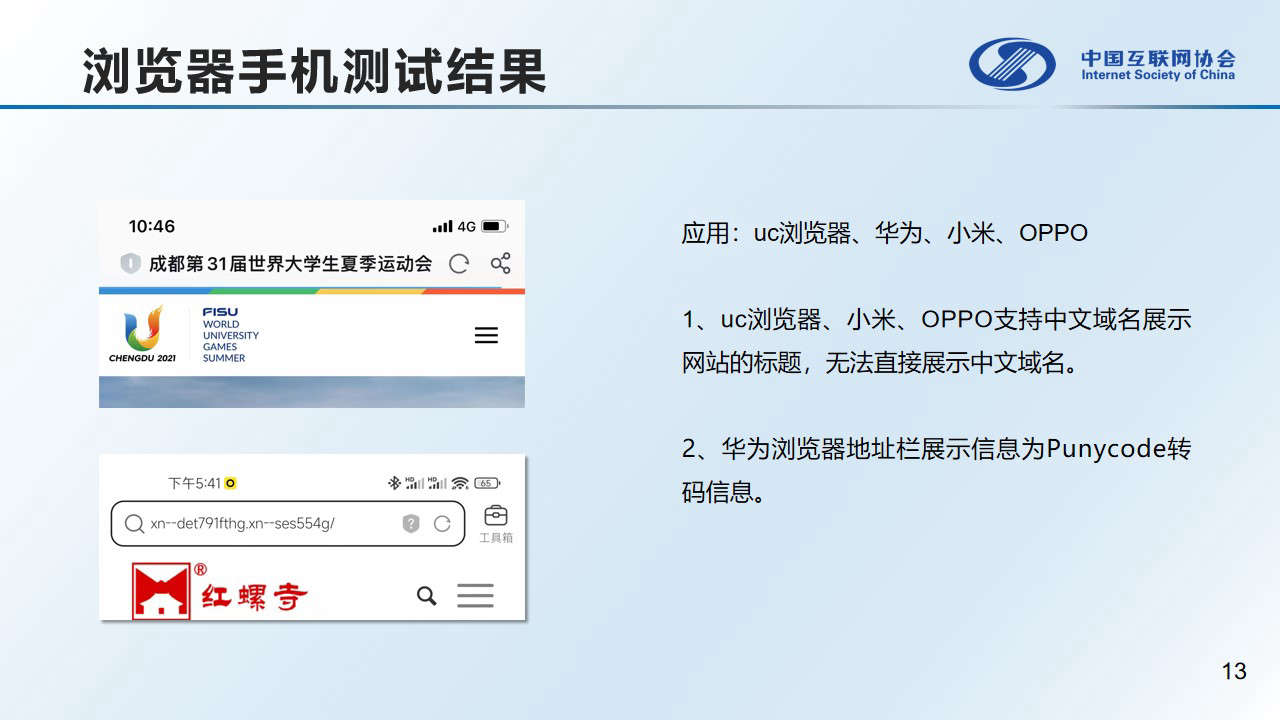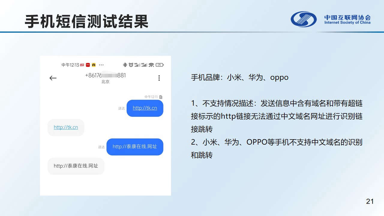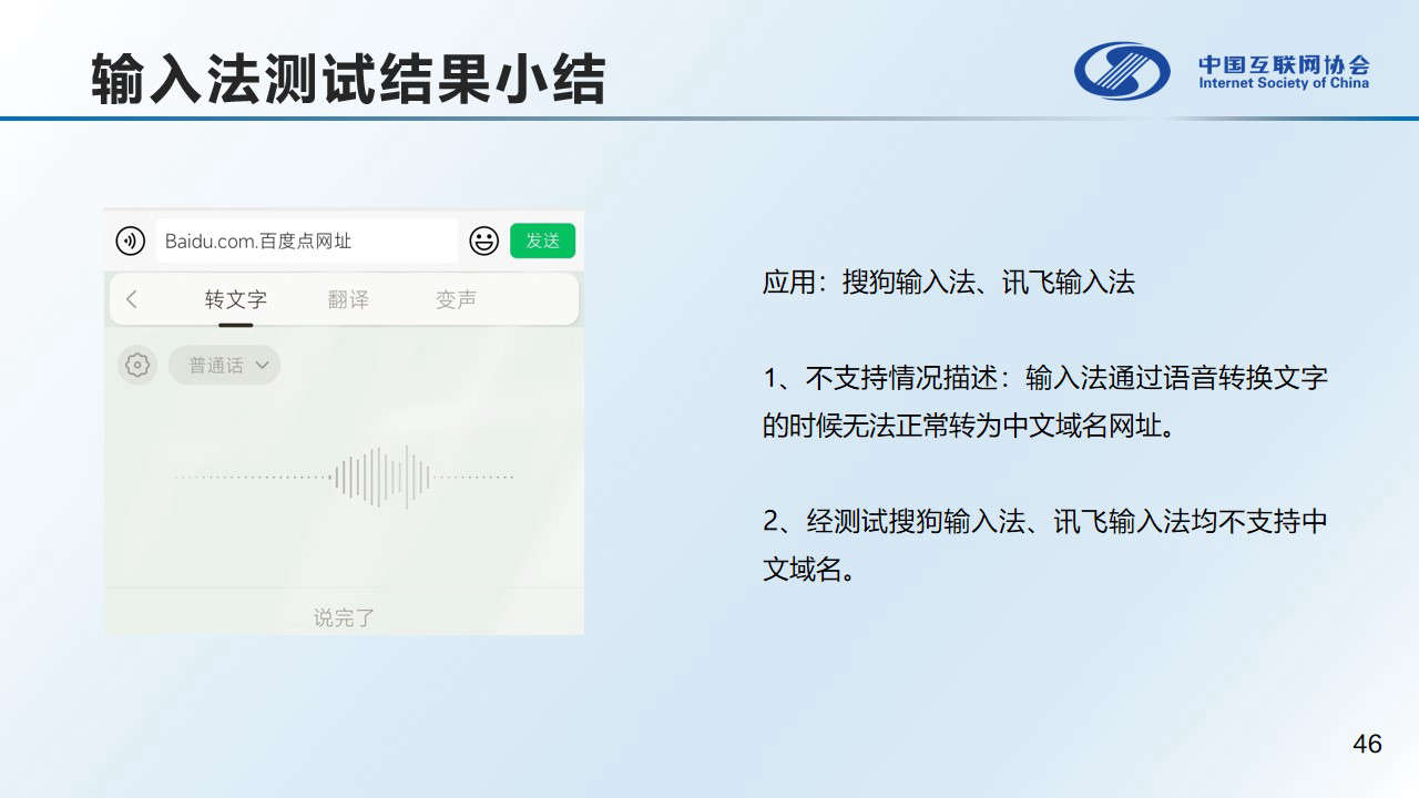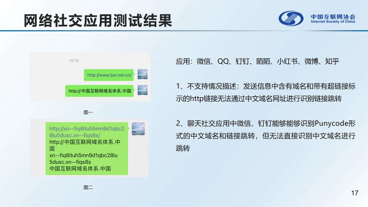 论坛上,中国互联网协会副理事长何桂立发布了《中文域名应用测试报告》,报告阐述了支持中文域名应用的表现形式,以及对浏览器、聊天社交、手机短信、短视频、搜索引擎、购物支付、开发平台、邮箱、输入法9个类别的应用进行了中文域名识别情况的测试。报告中总结指出:“ 由于我国不少互联网应用厂商未能为网民提供便捷的中文域名使用环境,导致中文域名的深化推广和应用在年轻人中滞后。”同时《报告》还给出了指导中文域名应用环境改善的多项建议。