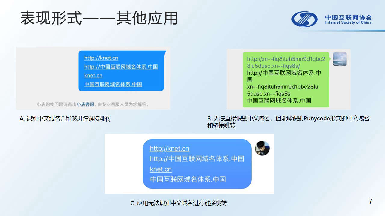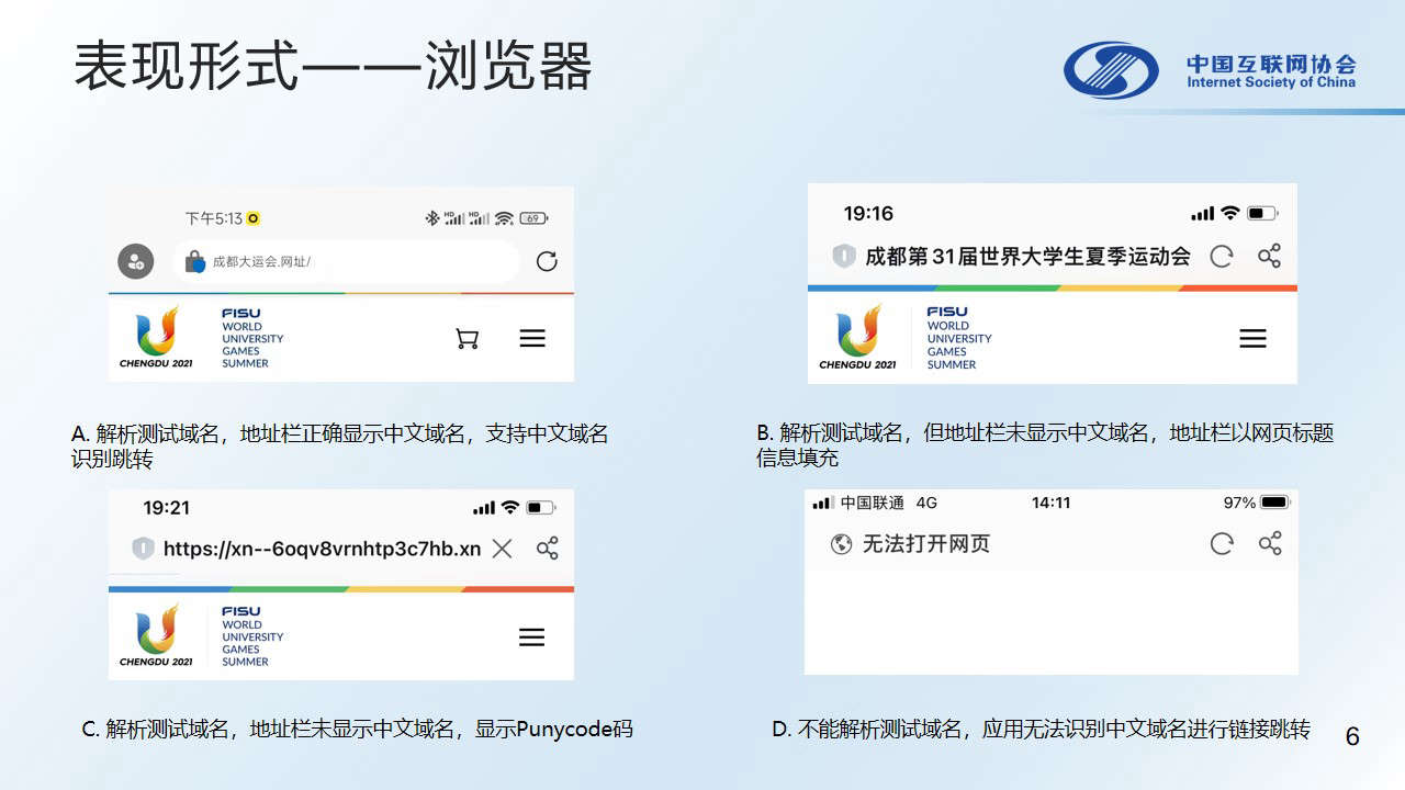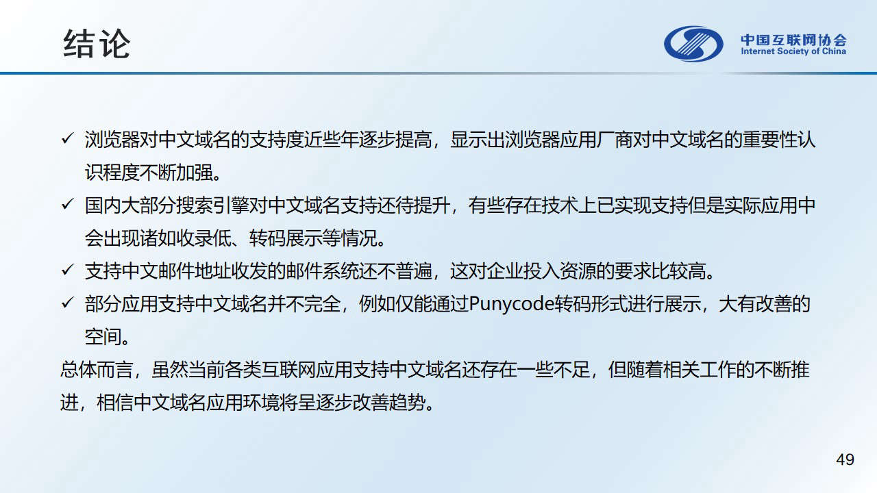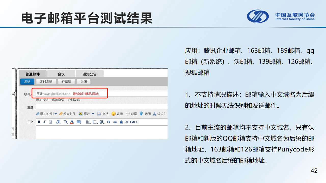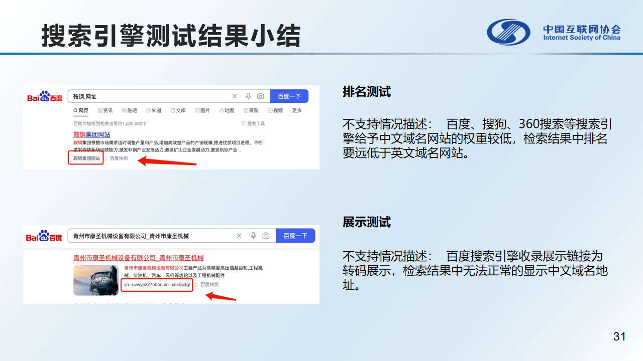 论坛上,中国互联网协会副理事长何桂立发布了《中文域名应用测试报告》,报告阐述了支持中文域名应用的表现形式,以及对浏览器、聊天社交、手机短信、短视频、搜索引擎、购物支付、开发平台、邮箱、输入法9个类别的应用进行了中文域名识别情况的测试。报告中总结指出:“ 由于我国不少互联网应用厂商未能为网民提供便捷的中文域名使用环境,导致中文域名的深化推广和应用在年轻人中滞后。”同时《报告》还给出了指导中文域名应用环境改善的多项建议。