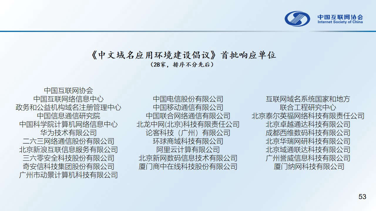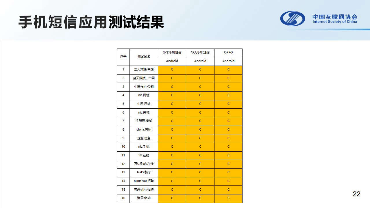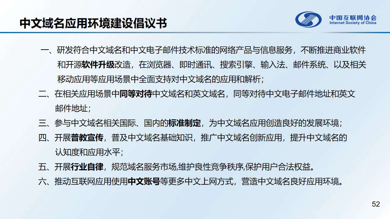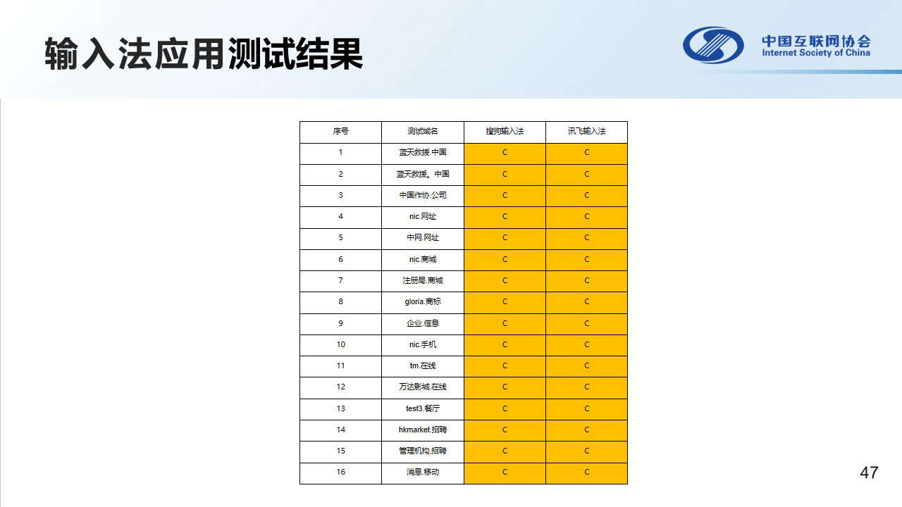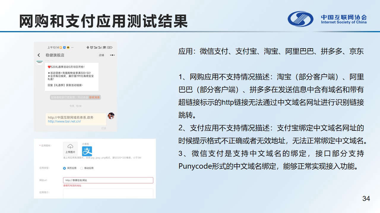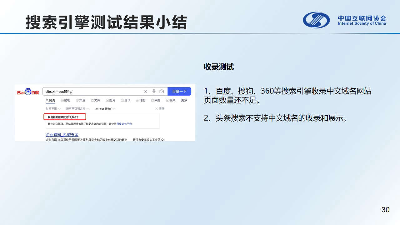 论坛上,中国互联网协会副理事长何桂立发布了《中文域名应用测试报告》,报告阐述了支持中文域名应用的表现形式,以及对浏览器、聊天社交、手机短信、短视频、搜索引擎、购物支付、开发平台、邮箱、输入法9个类别的应用进行了中文域名识别情况的测试。报告中总结指出:“ 由于我国不少互联网应用厂商未能为网民提供便捷的中文域名使用环境,导致中文域名的深化推广和应用在年轻人中滞后。”同时《报告》还给出了指导中文域名应用环境改善的多项建议。